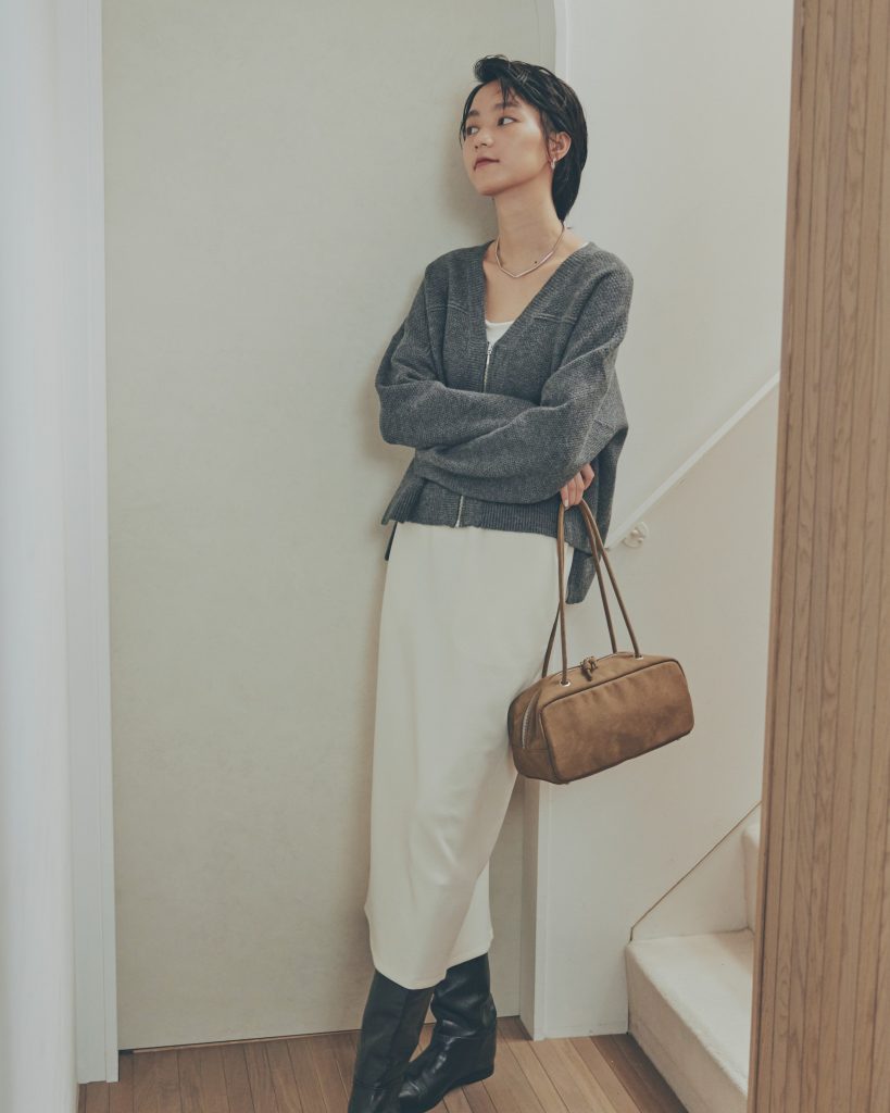 スカート合わせで甘辛コーデを楽しむのもおすすめ。