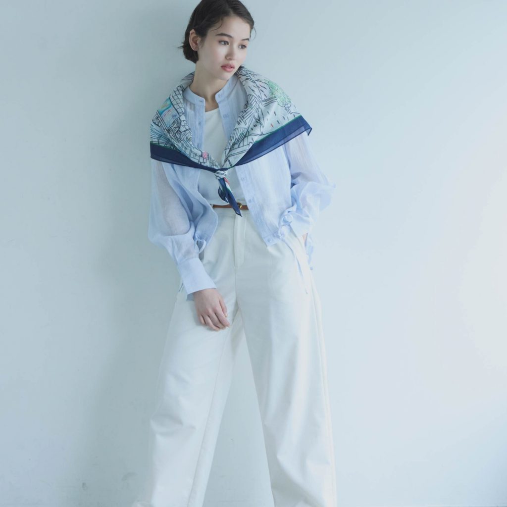 顔回りがすっきり見えるバンドカラー、袖と後身頃にはタックを入れて